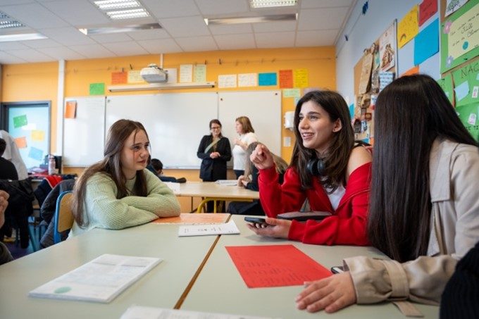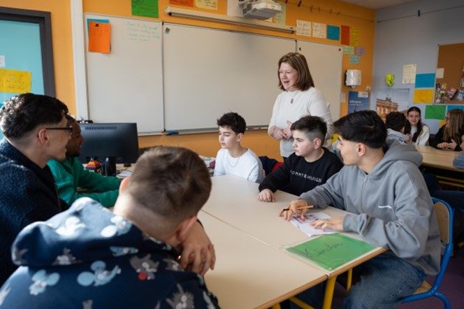 20 Schüler:innen des Jahrgangs 7, 9 und 10 sollten im März 2024 die Möglichkeit haben mit französischen Schüler:innen des collège Denis Diderot an gemeinsamen Workshops teilzunehmen. Themen sollten sein: Unterschiede der Schulformen, soziales Engagement, Hobbys und Berufswünsche. Am 20. Februar lernten sie ihre neue Kollegin, Hélène Nowacki, im Collège Denis Diderot kennen und nahmen am Unterricht der 5. Klasse teil.